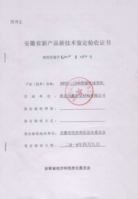 2010年4月9日,淮北宇鑫新型材料有限公司独立开发、研制具有自主知识产权的“MYC-1200型锚杆成型机”新产品鉴定会在安徽省淮北市举行。省内工程机械行业的专家教授,安徽省经济和信息化委员会、淮北市、濉溪县经济和信息化委员会、淮北市科技局及金锚公司领导、科研人员参加了本次鉴定会。